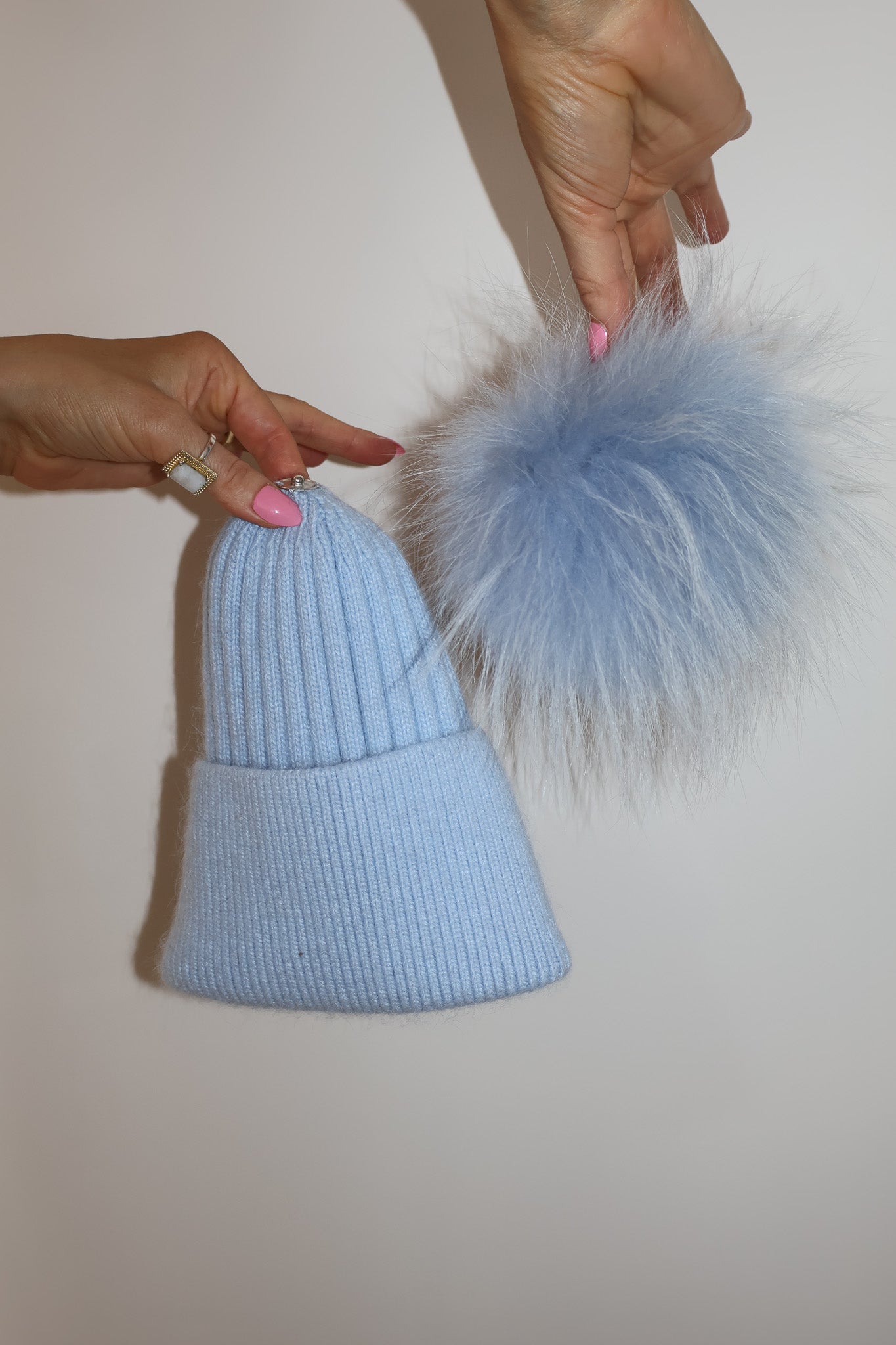 Detachable 100% racoon fur pom; press-stud attachment.