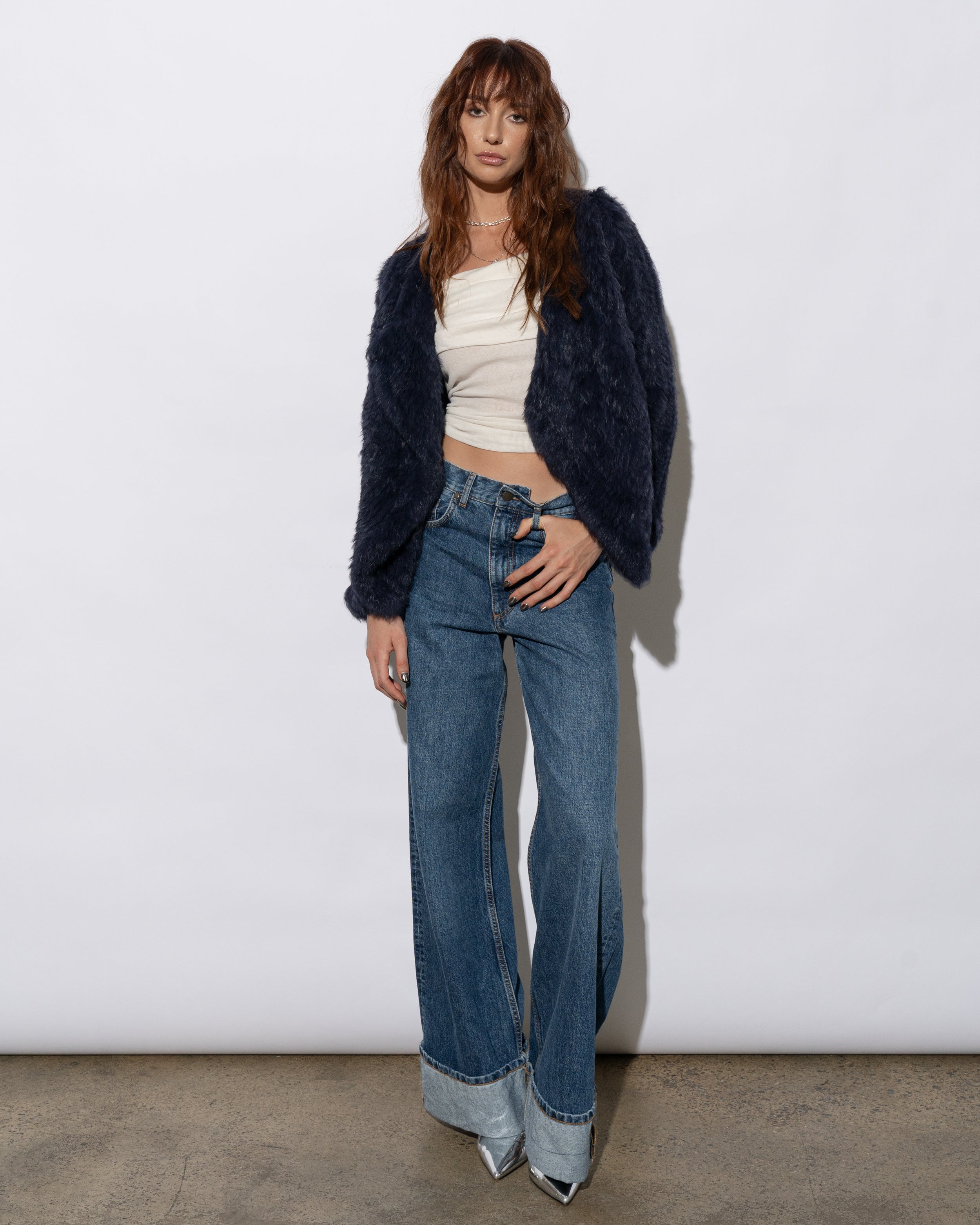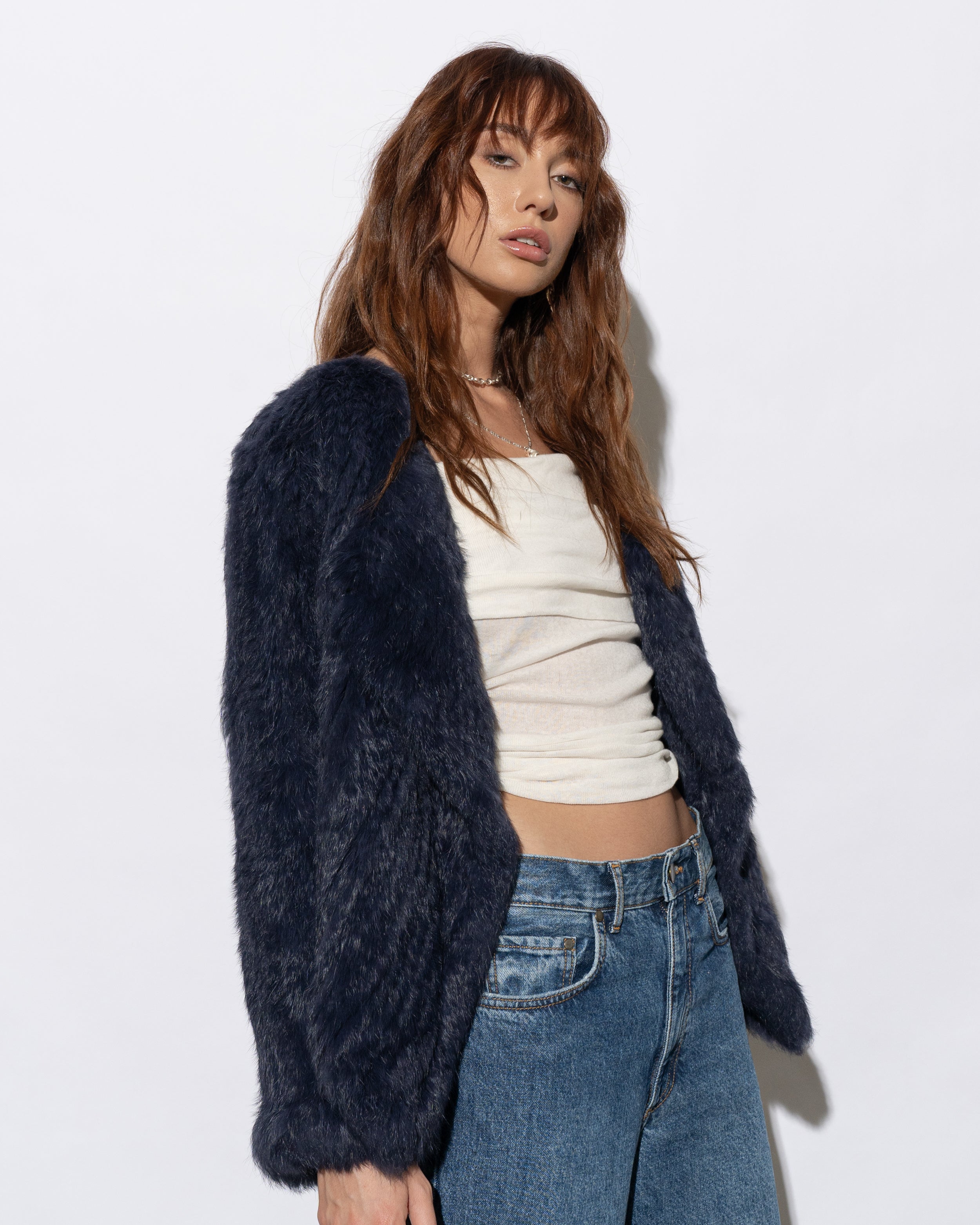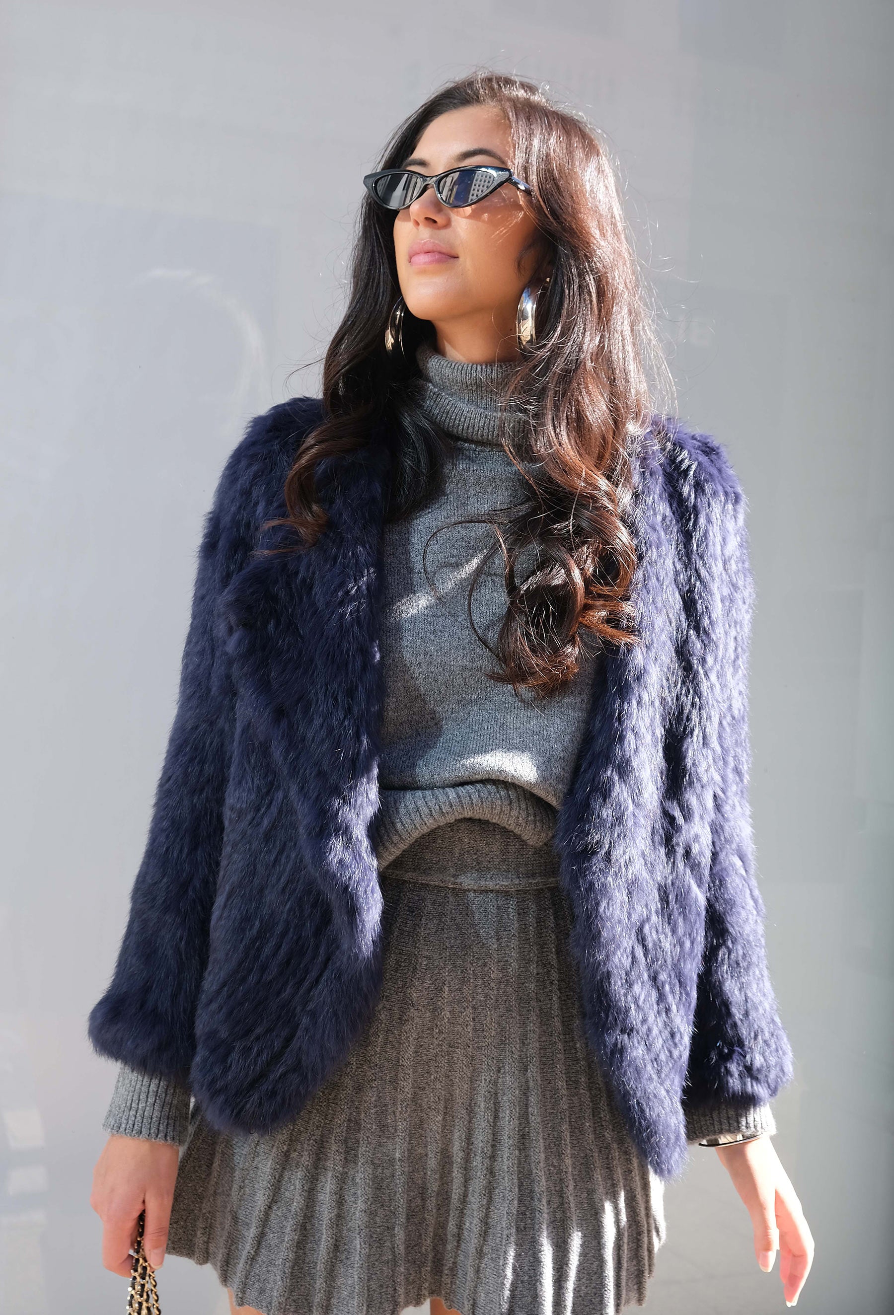 Dare to ride the style waves with the Elliott Biker Jacket in Navy. Its comfy fit, soft lightweight texture and knitted rabbit fur lining make it as easy to wear and just as easy on the eye. Pairing well for all occasions, the exaggerated lapels and cropped curved back hemline creates an effortless addition to style with your existing wardrobe staples.