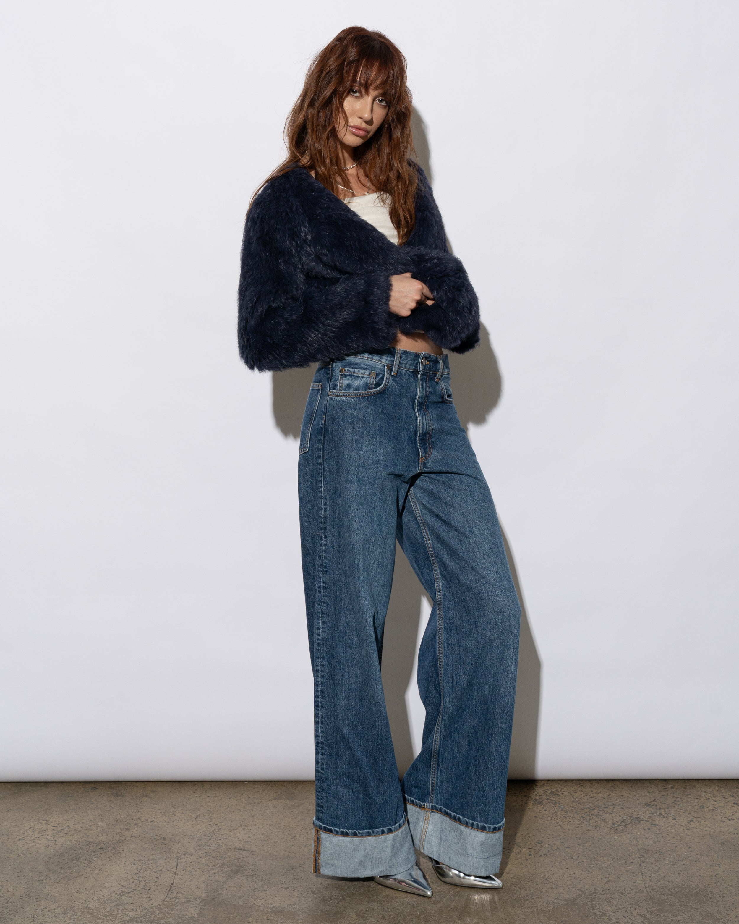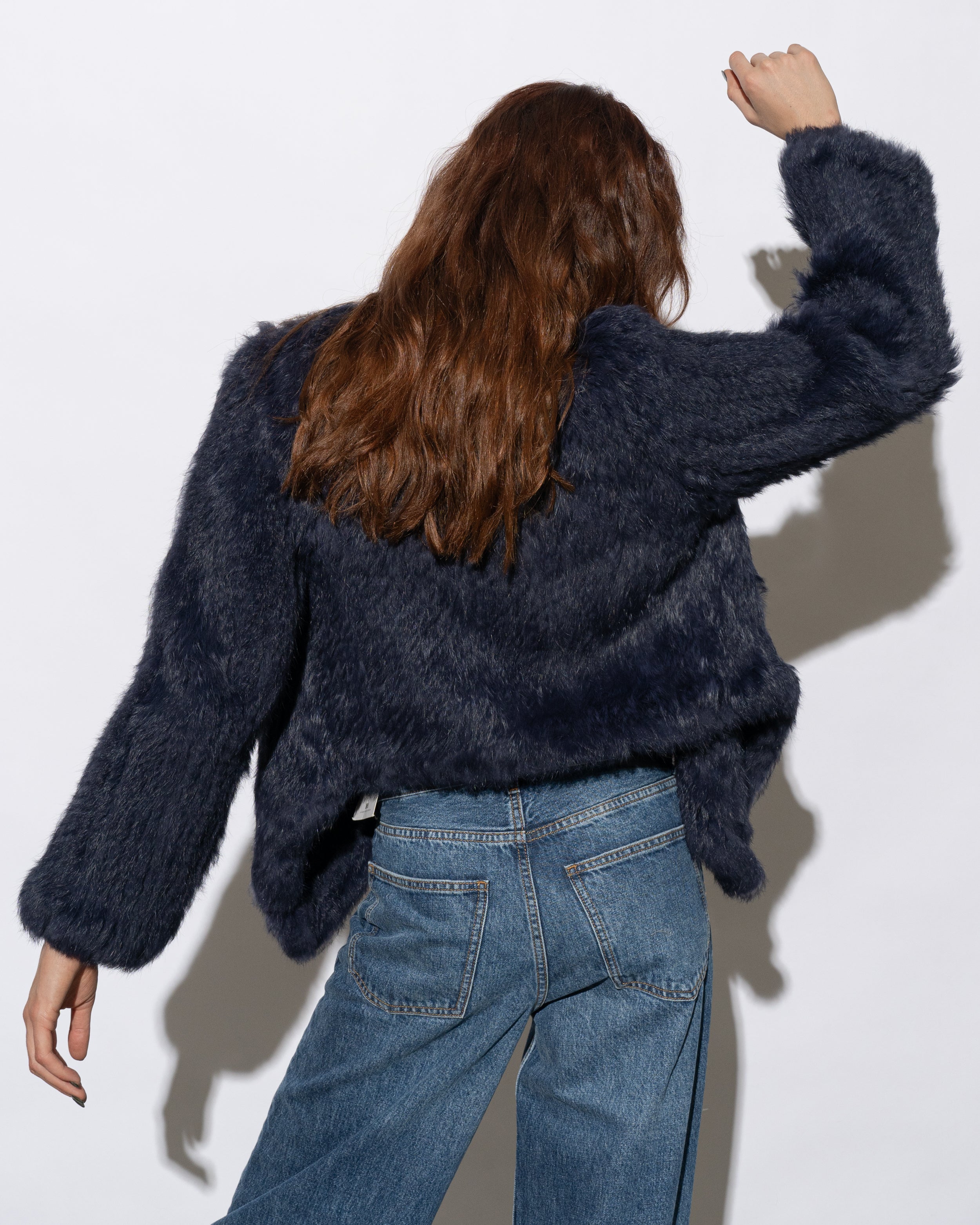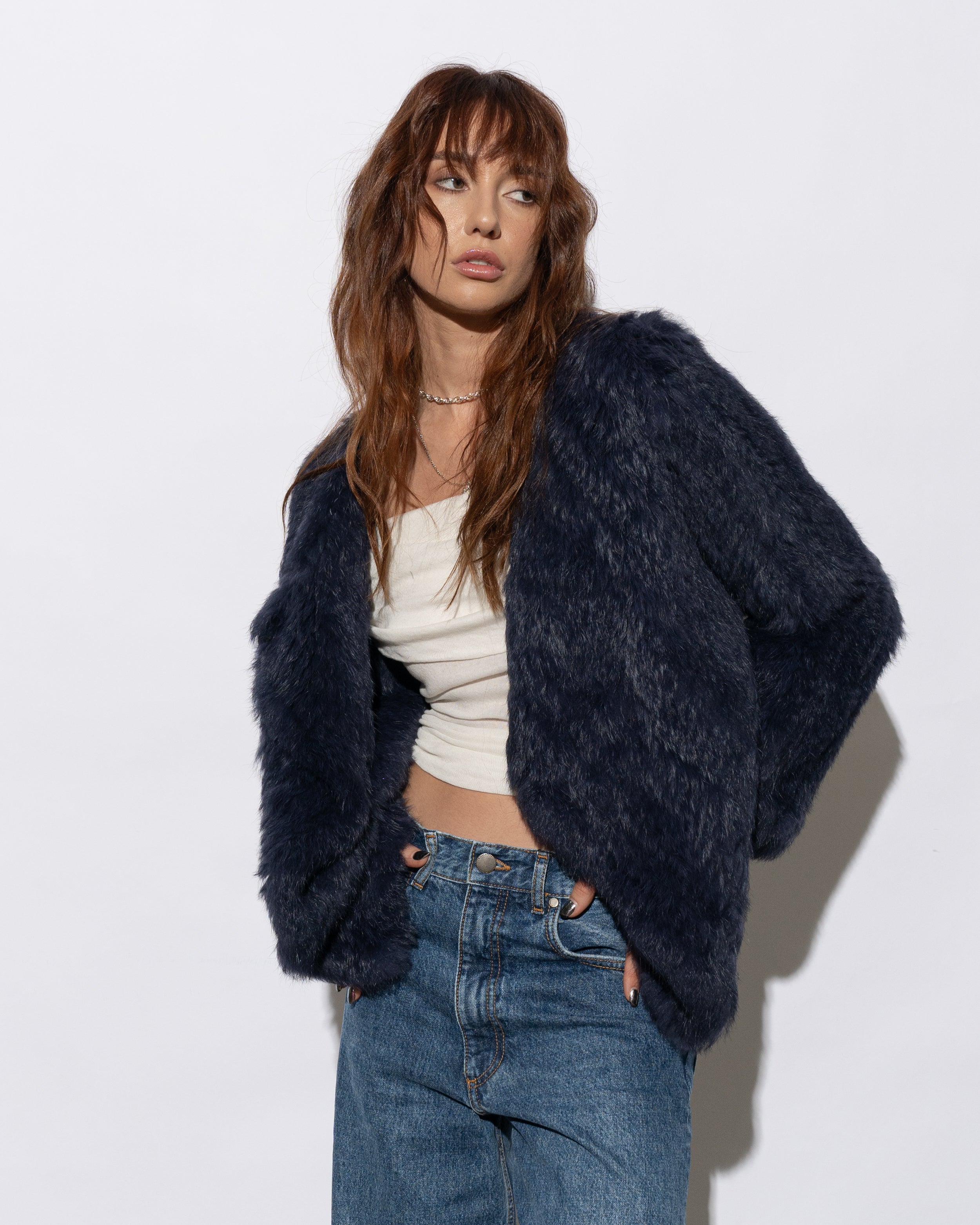 Dare to ride the style waves with the Elliott Biker Jacket in Navy. Its comfy fit, soft lightweight texture and knitted rabbit fur lining make it as easy to wear and just as easy on the eye. Pairing well for all occasions, the exaggerated lapels and cropped curved back hemline creates an effortless addition to style with your existing wardrobe staples.