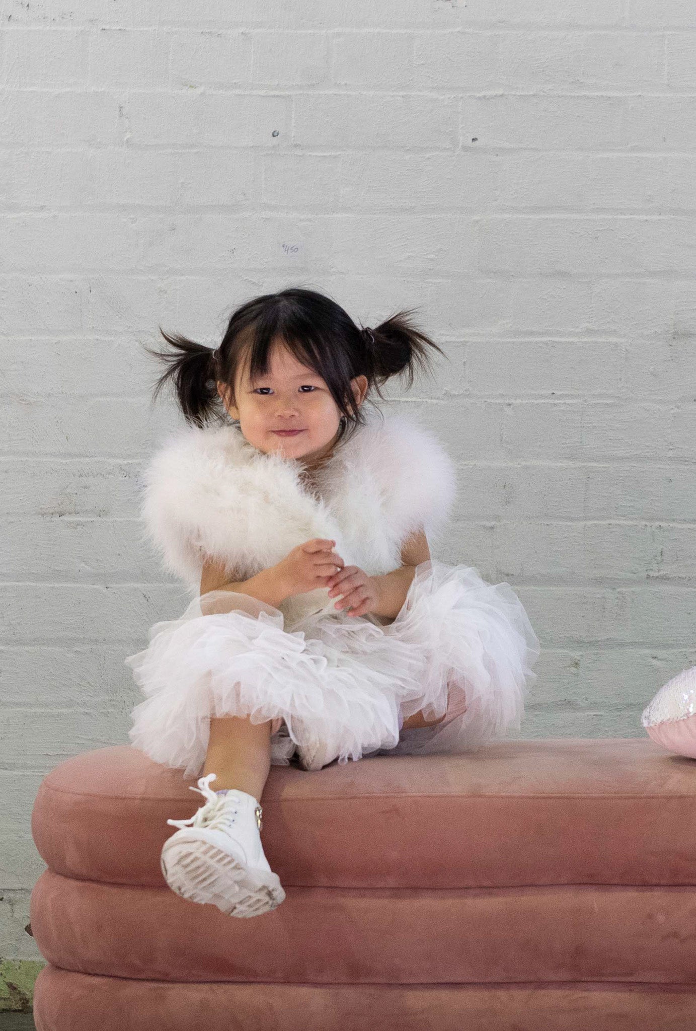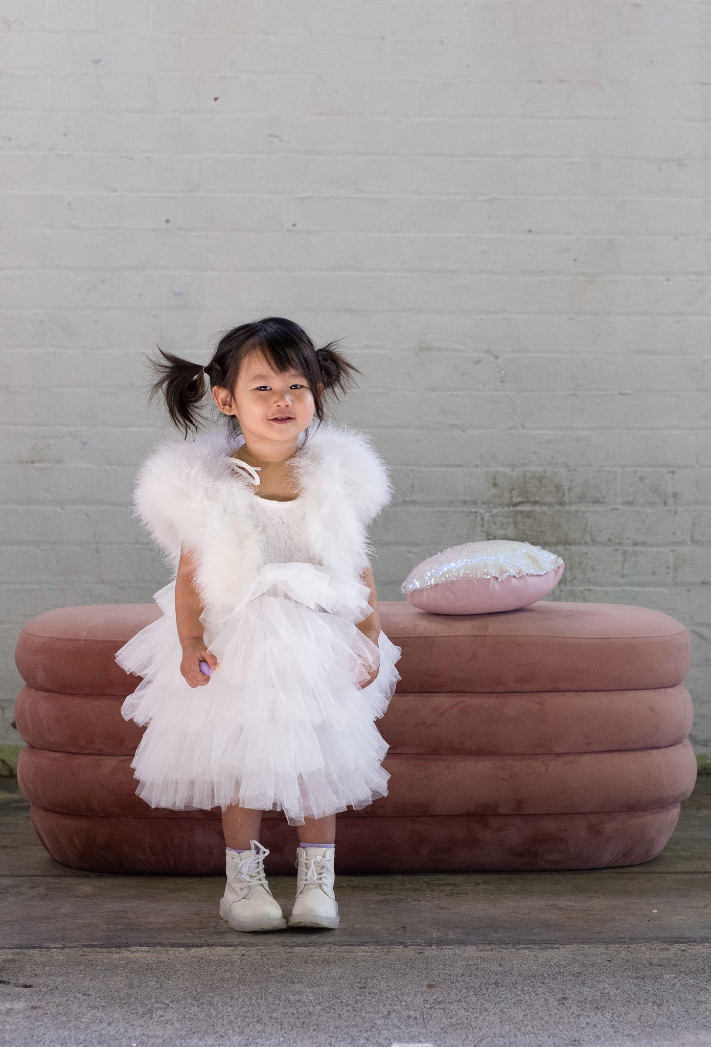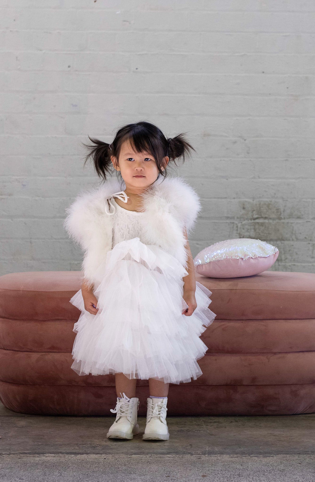 The Kids Plume Bolero in Snow is a perfect little cover up for both everyday wear and special occasions. The cropped style is designed to be worn open, providing a little extra warmth while complimenting every outfit. This bolero is made from soft marabou feather and is lined with satin on the inside making it incredibly lightweight.