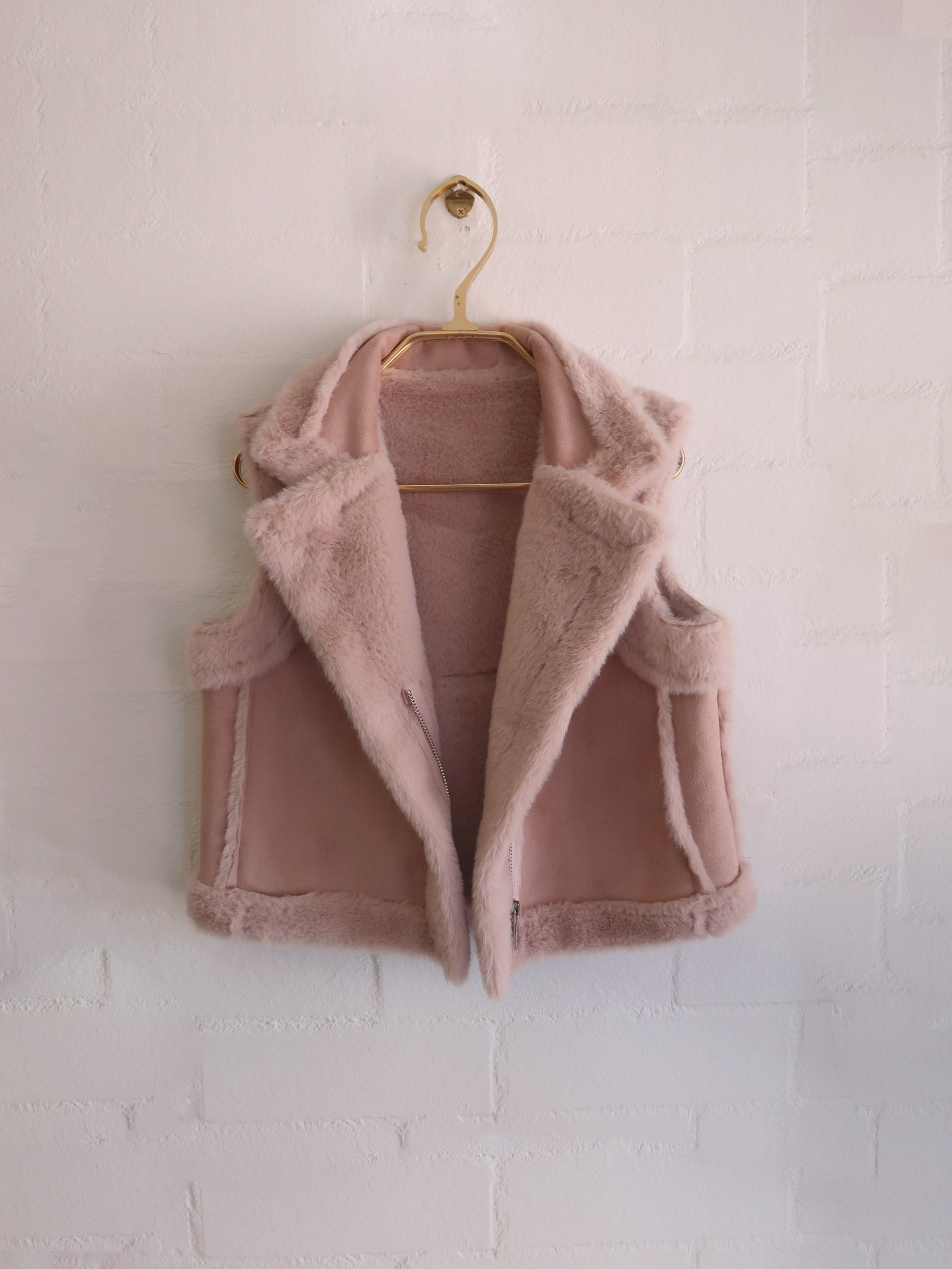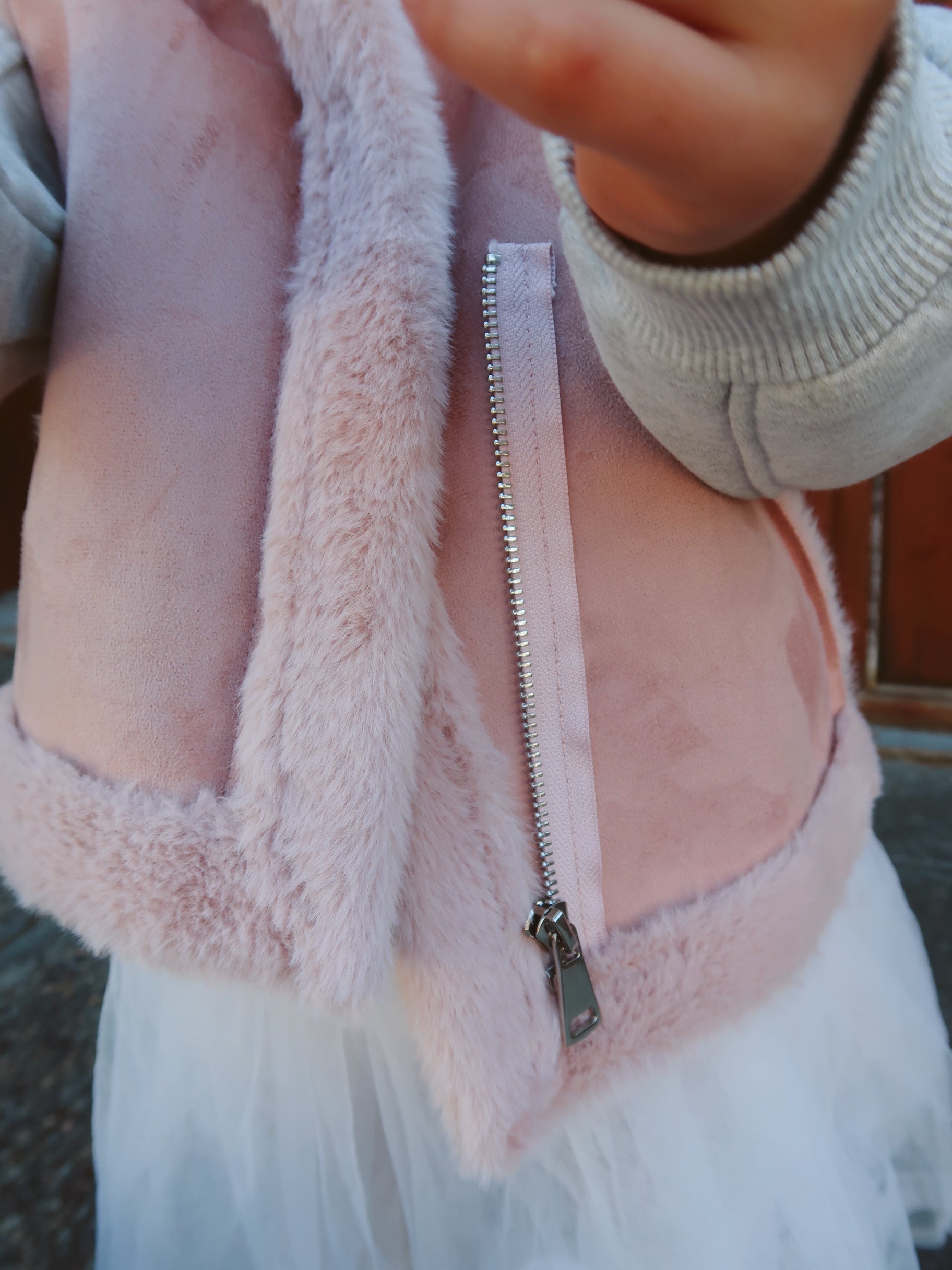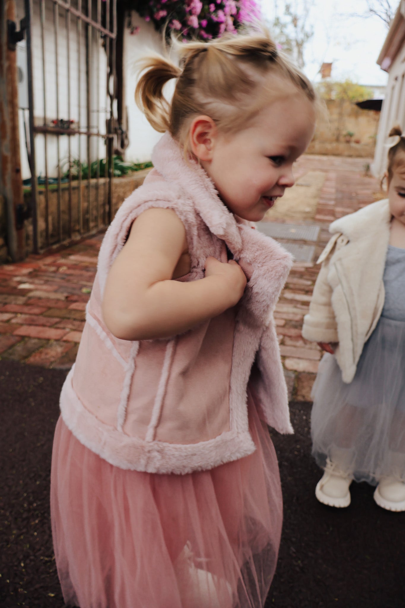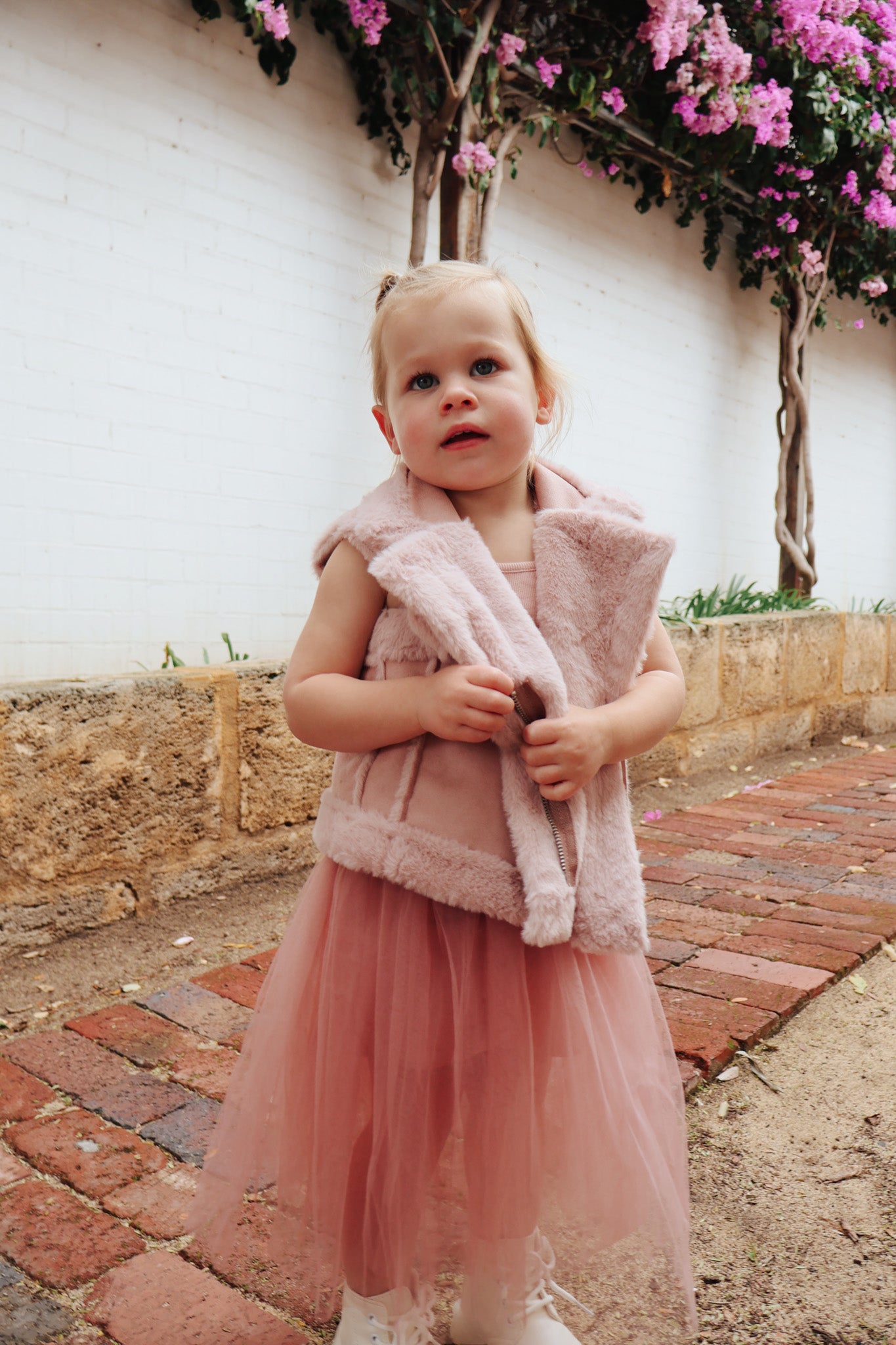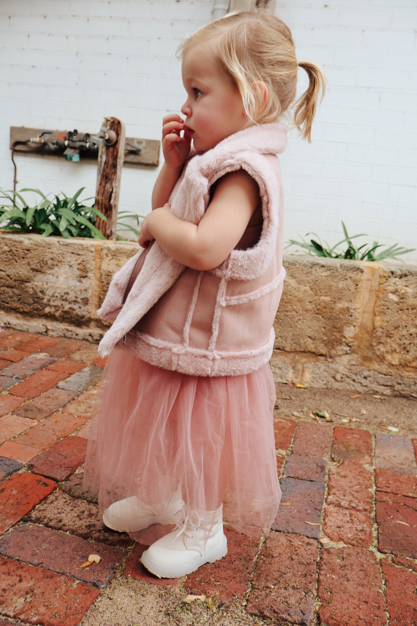 Meet the latest in our Mini Mode winter collection. The Lulu Biker Vest in Dusty Pink. With its stunning soft faux fur interior lining, to faux suede panel detailing and zippers - this coat is designed to turn heads when your little one is on her way for a babycino.