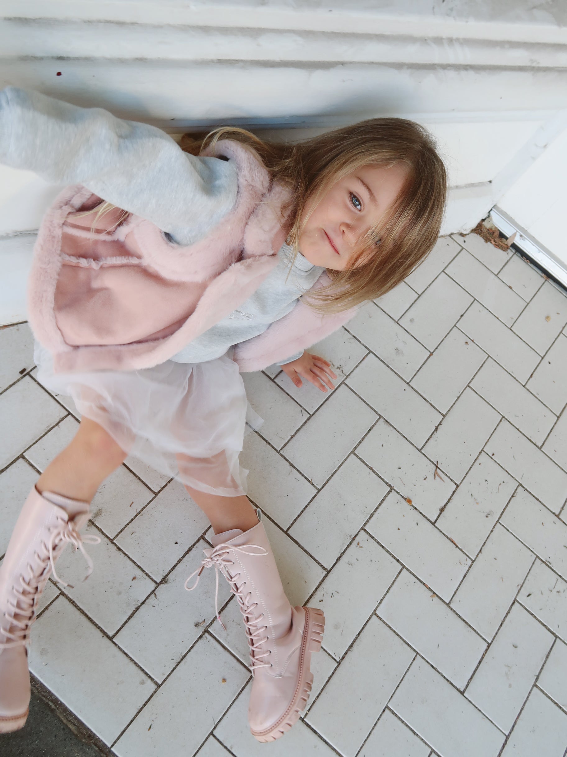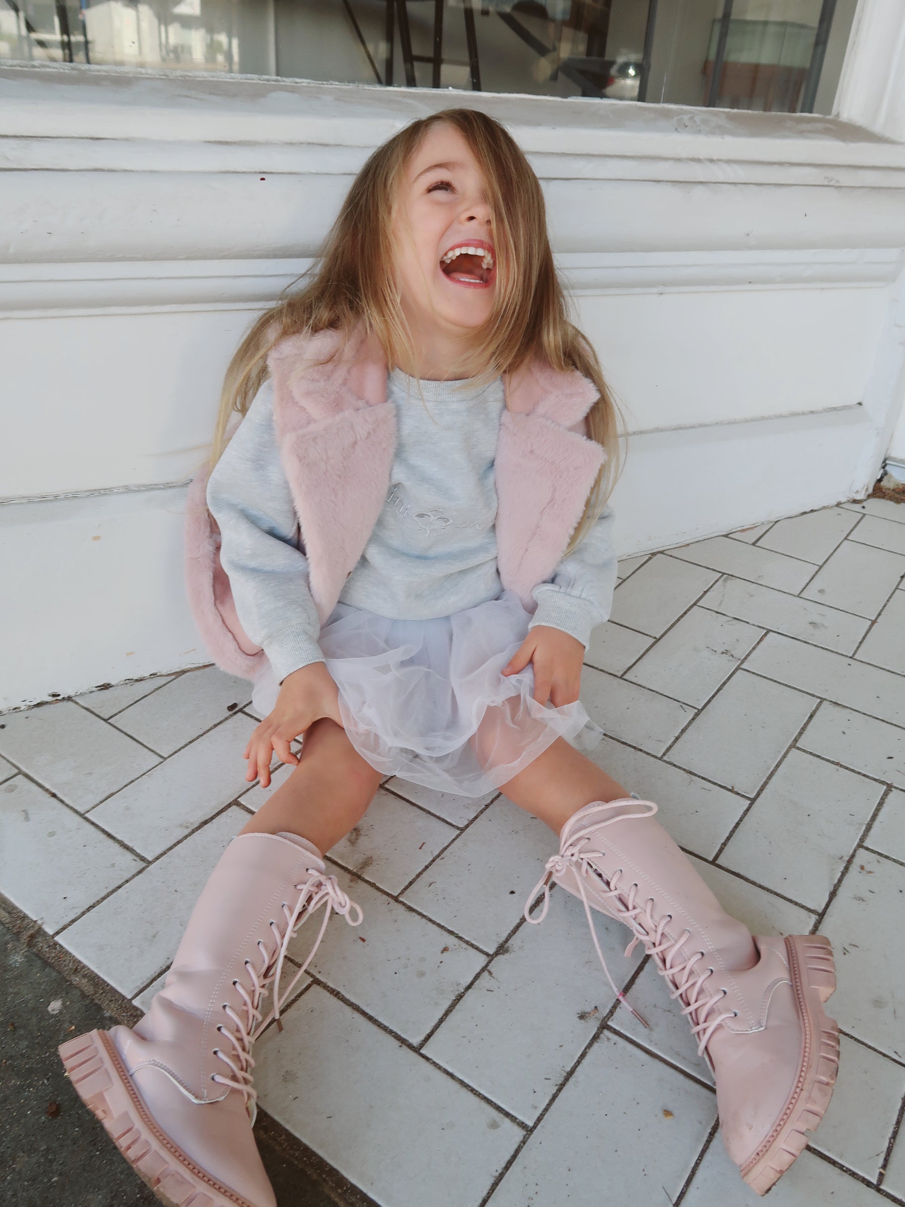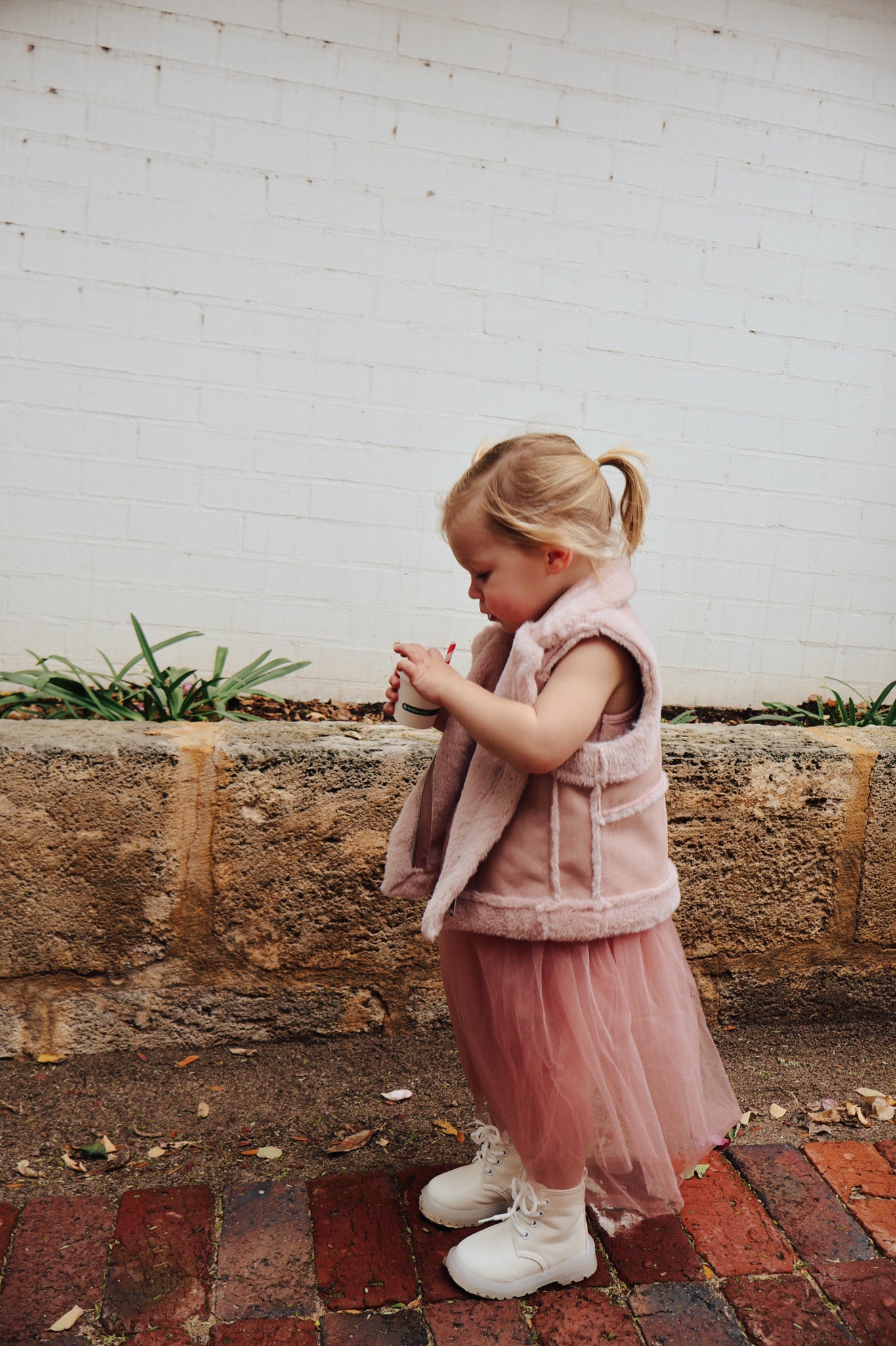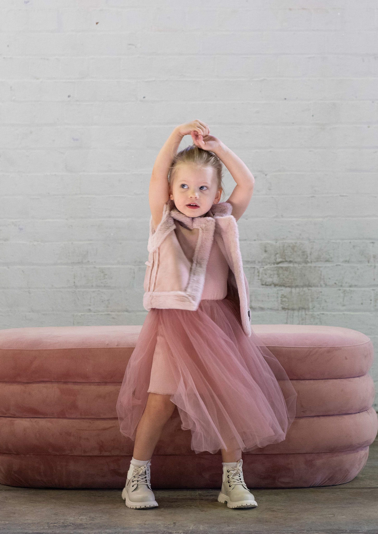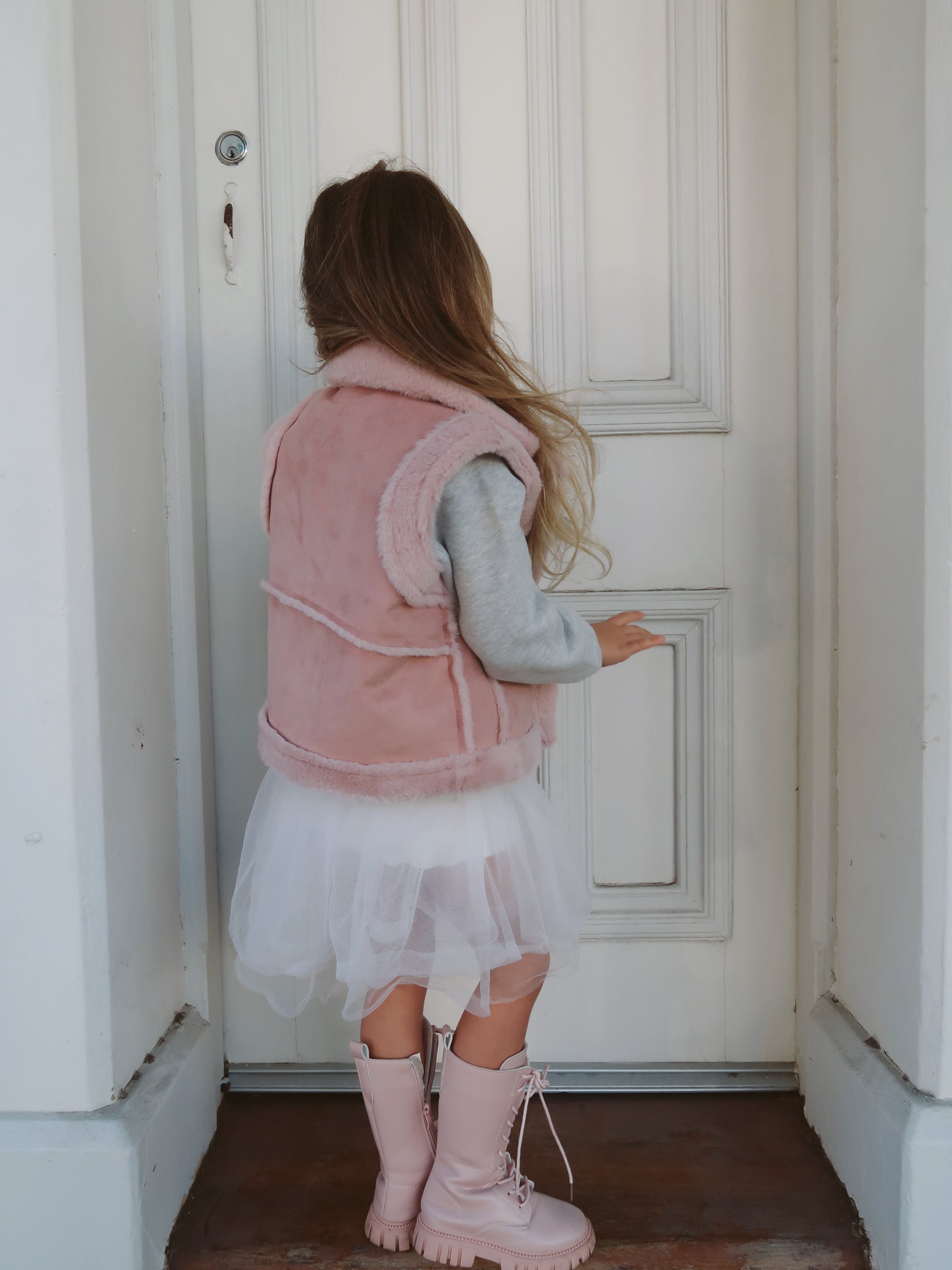 Meet the latest in our Mini Mode winter collection. The Lulu Biker Vest in Dusty Pink. With its stunning soft faux fur interior lining, to faux suede panel detailing and zippers - this coat is designed to turn heads when your little one is on her way for a babycino.