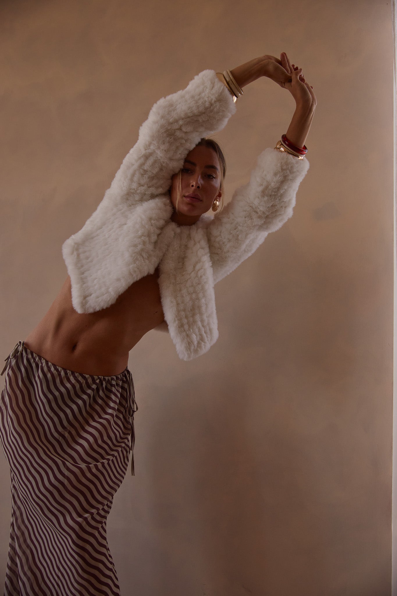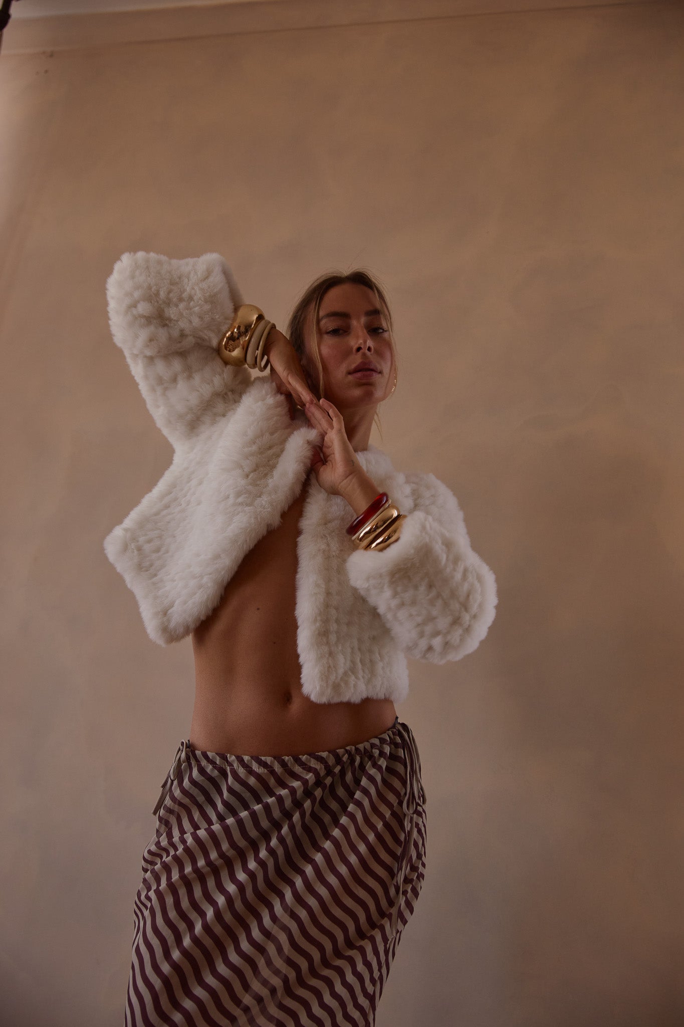 The gorgeous Macie Faux Fur long sleeve jacket exudes sophisticated elegance. While providing warmth and coverage with its velvety soft texture, its cropped length is designed to compliment that special outfit without compromising shape or detail.