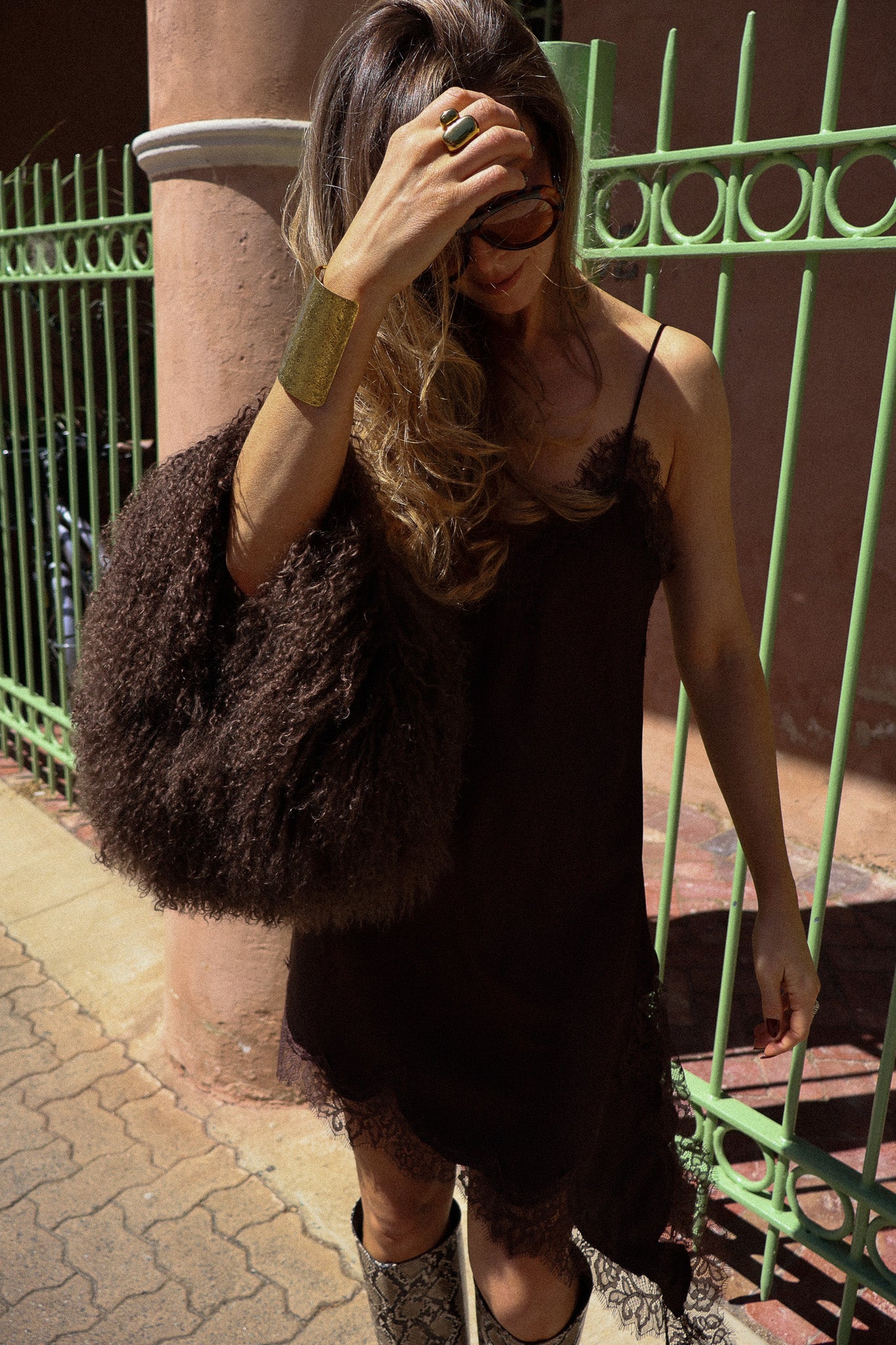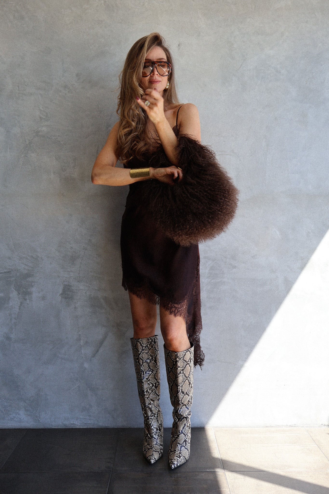 The Manhattan Bag in Cocoa is where luxury meets playful extravagance. Crafted from sumptuously soft Mongolian fur, this fluffy handbag delivers the kind of texture you can’t stop touching. The kind of glamour that turns every head in the room.