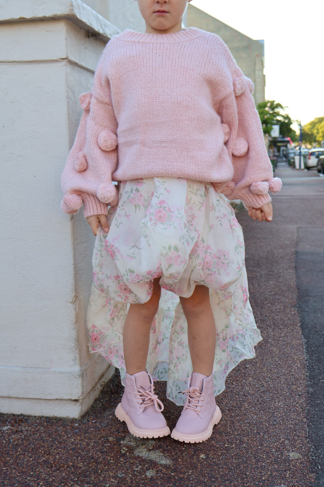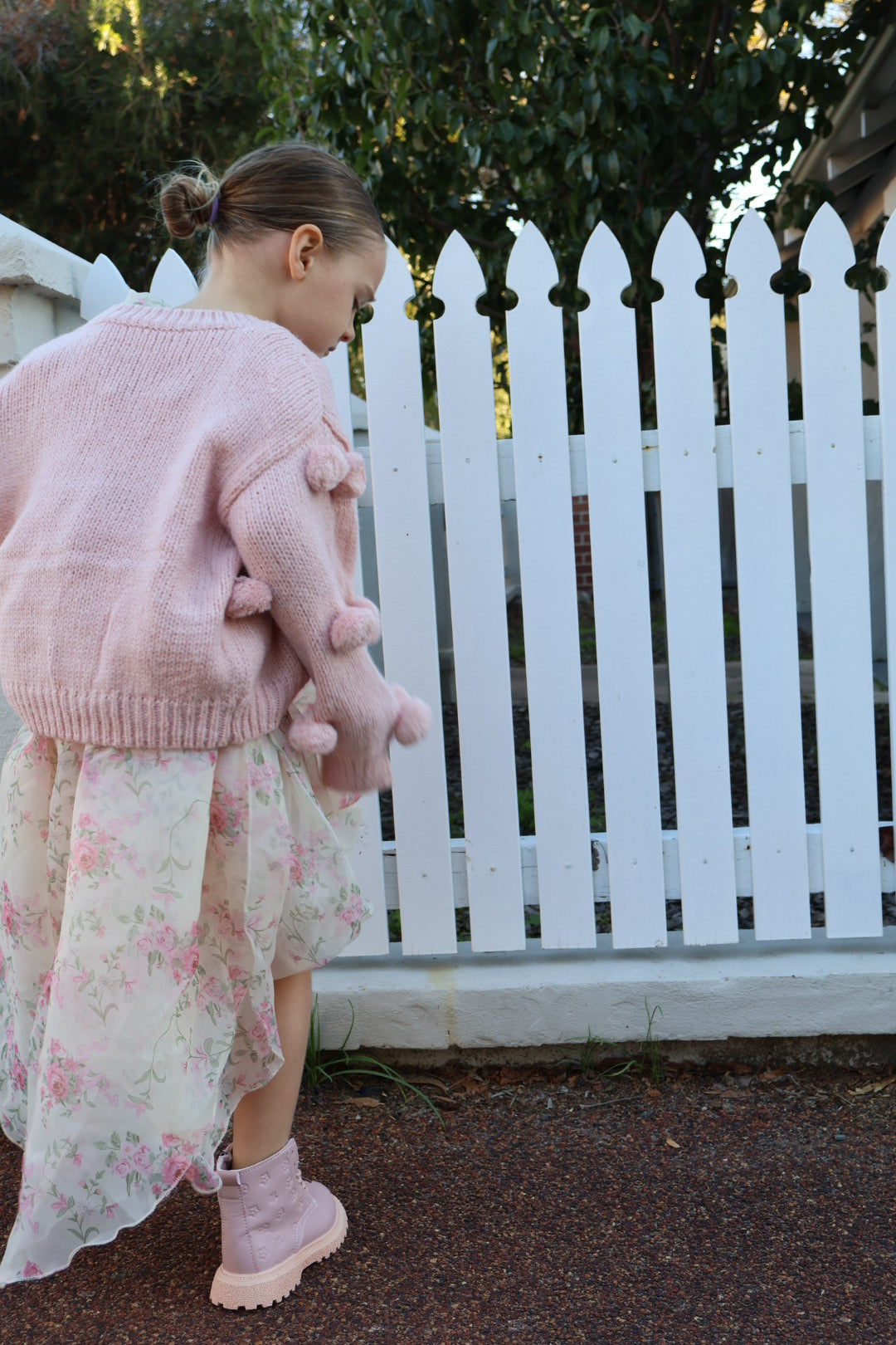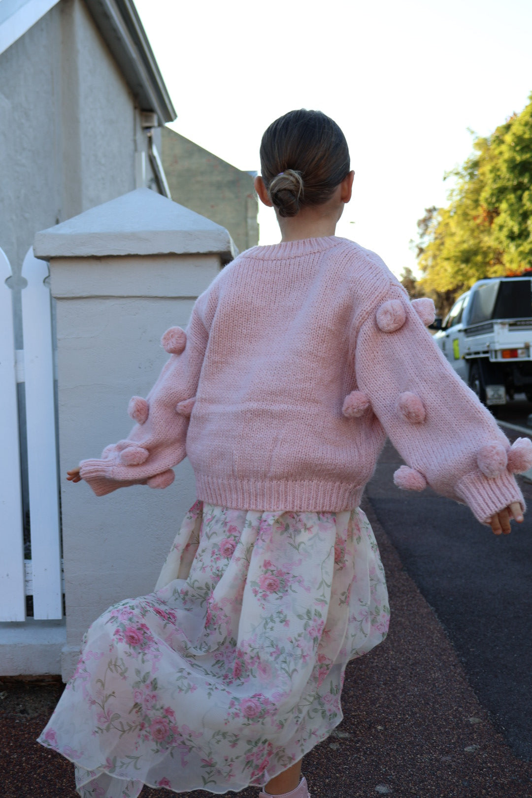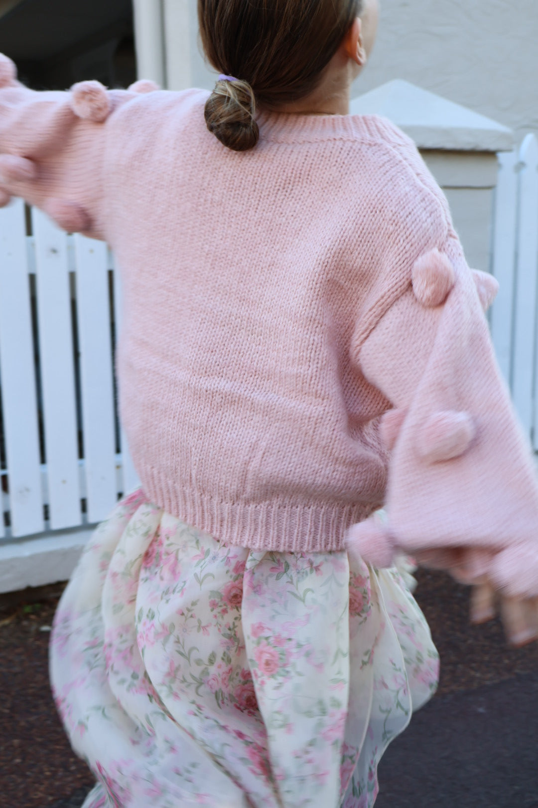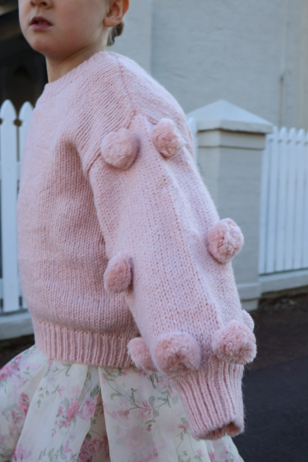 Delicate pom poms dance across the sleeves and bodice like tiny snowflakes, bringing a touch of fairytale charm to this cosy knit. The creamy Dusty Pink hue is as sweet as a lullaby and pairs like a dream with anything from tutus to tiny trousers.