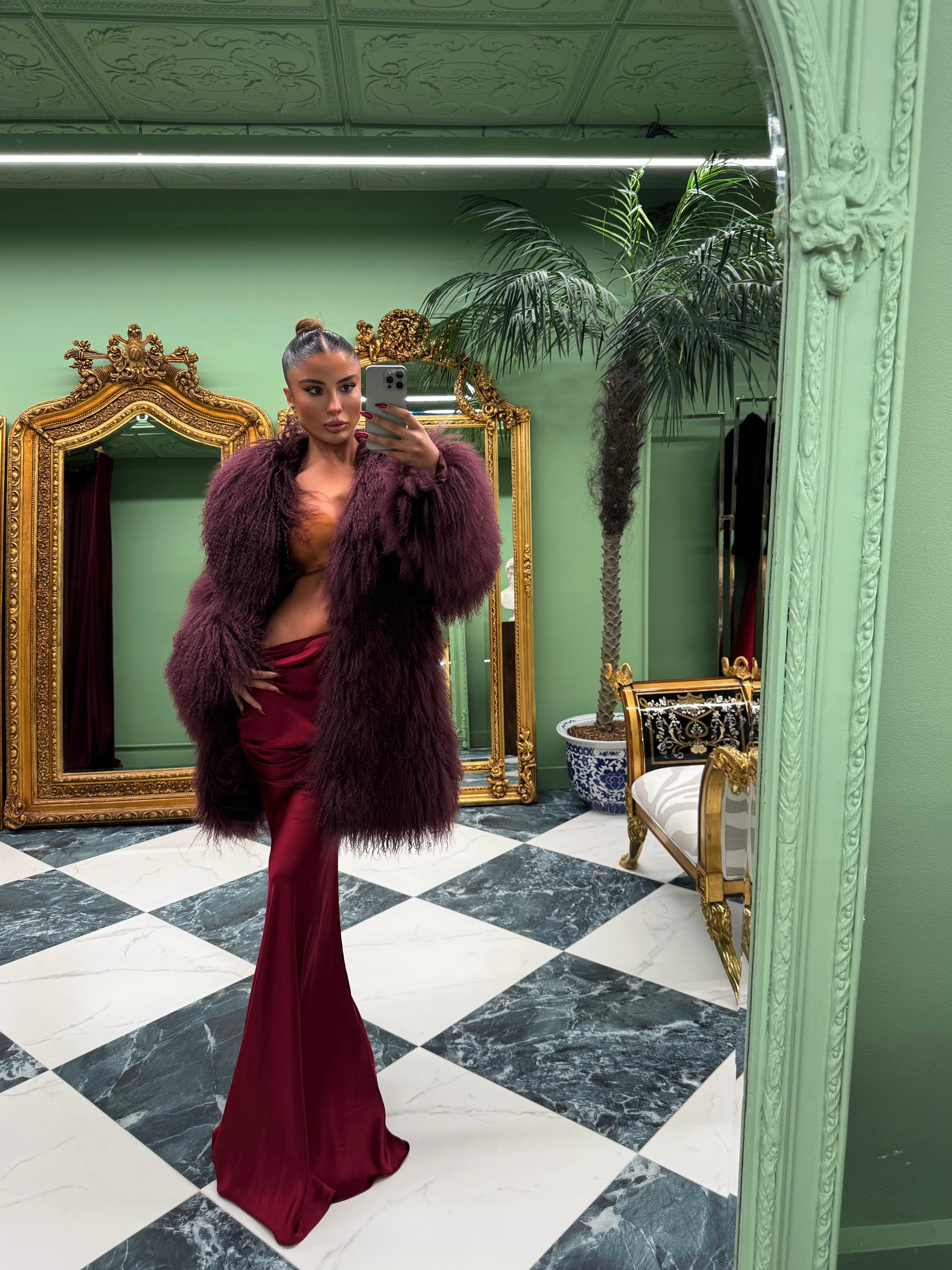 Our Mongolian Coat in deep Merlot is your winter indulgence; tactile, wildly luxurious, and unapologetically bold. Featuring a plush collar, deep-set pockets, and a mid-length silhouette that moves with you, this piece was designed to turn cold nights into fashion moments.