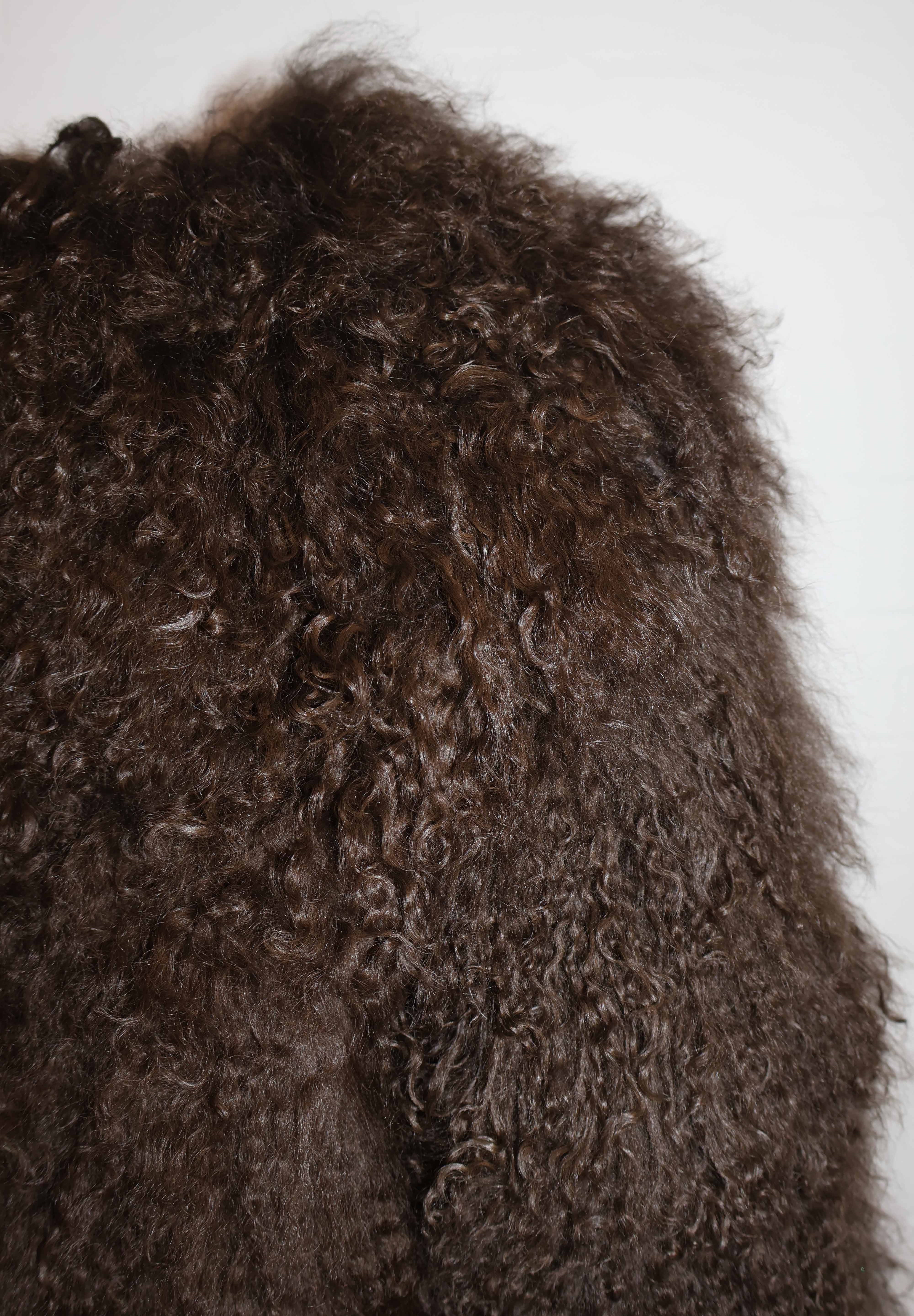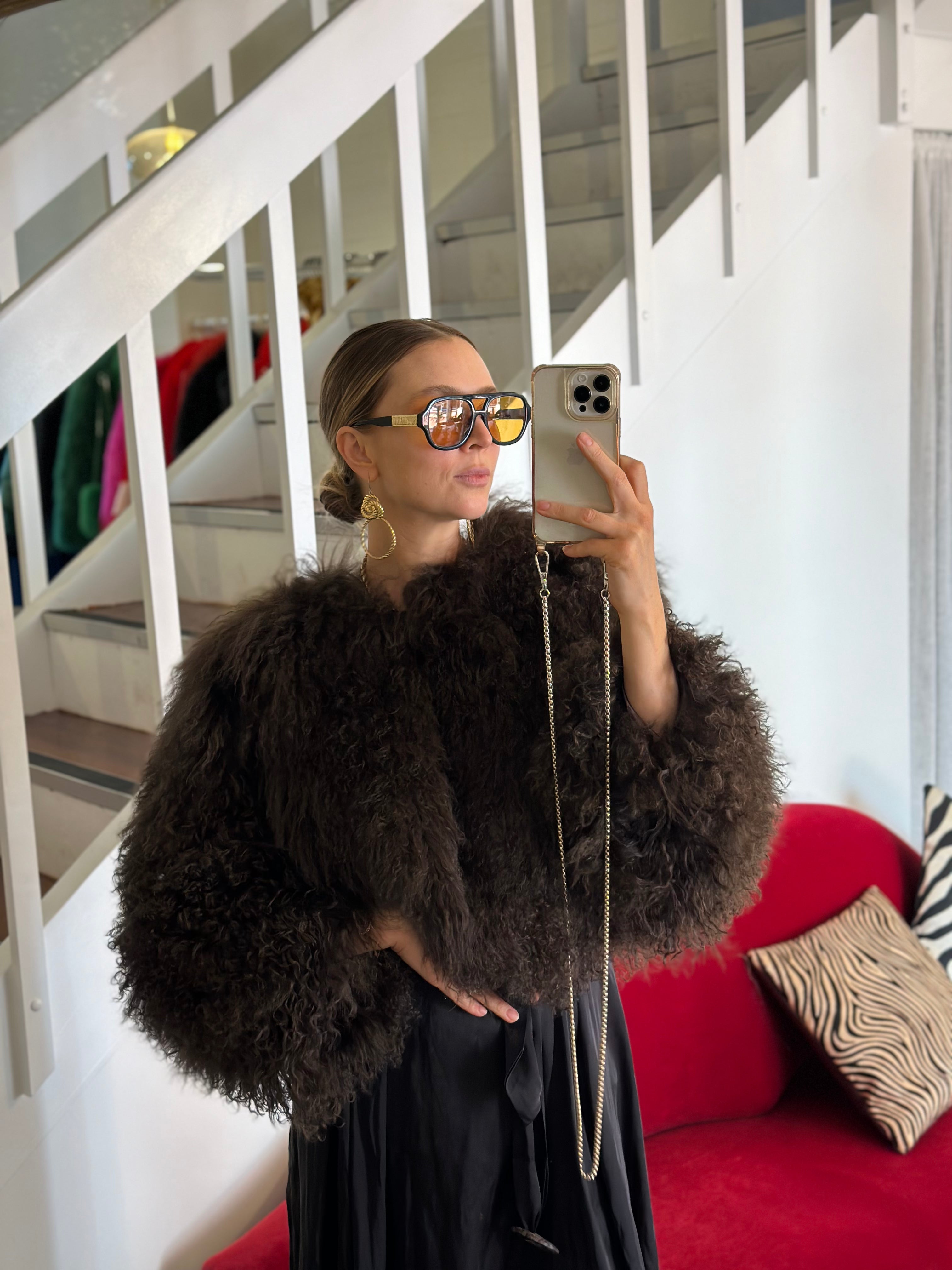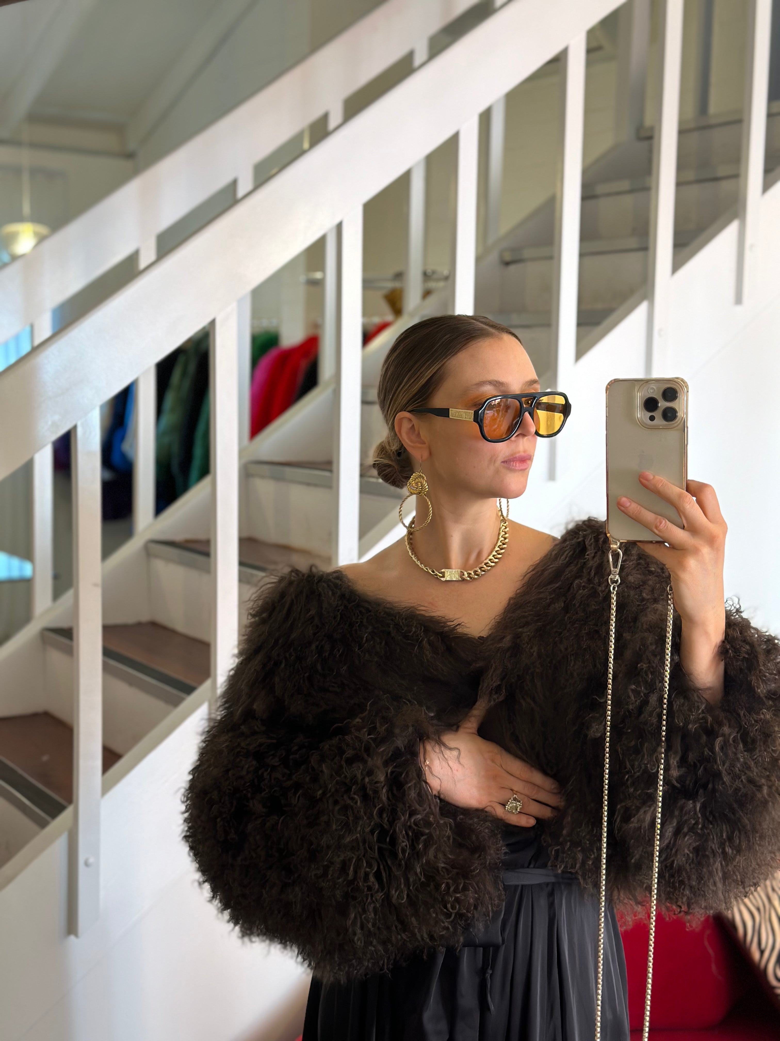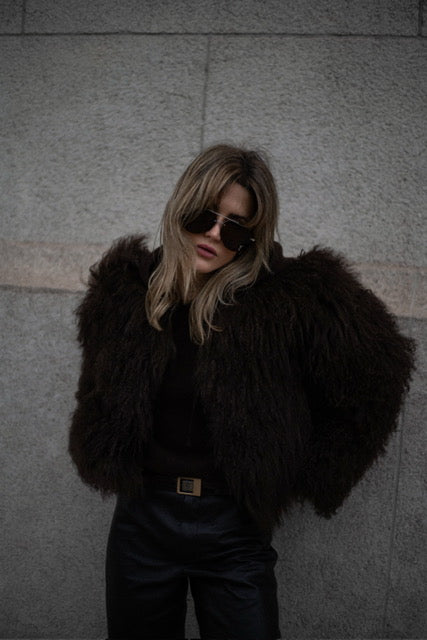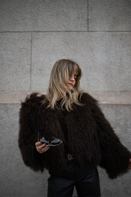 Wrap yourself in the timeless allure of the Evangelista Jacket, a piece that marries refined elegance with wild romance. This cocoa-brown Mongolian fur jacket is the centerpiece of our collaboration with Priscila Evangelista, known for her exquisite touch and devotion to luxurious textures. Each curl of plush Mongolian fur is chosen for its rich warmth, evoking the earthy allure of cocoa in winter.