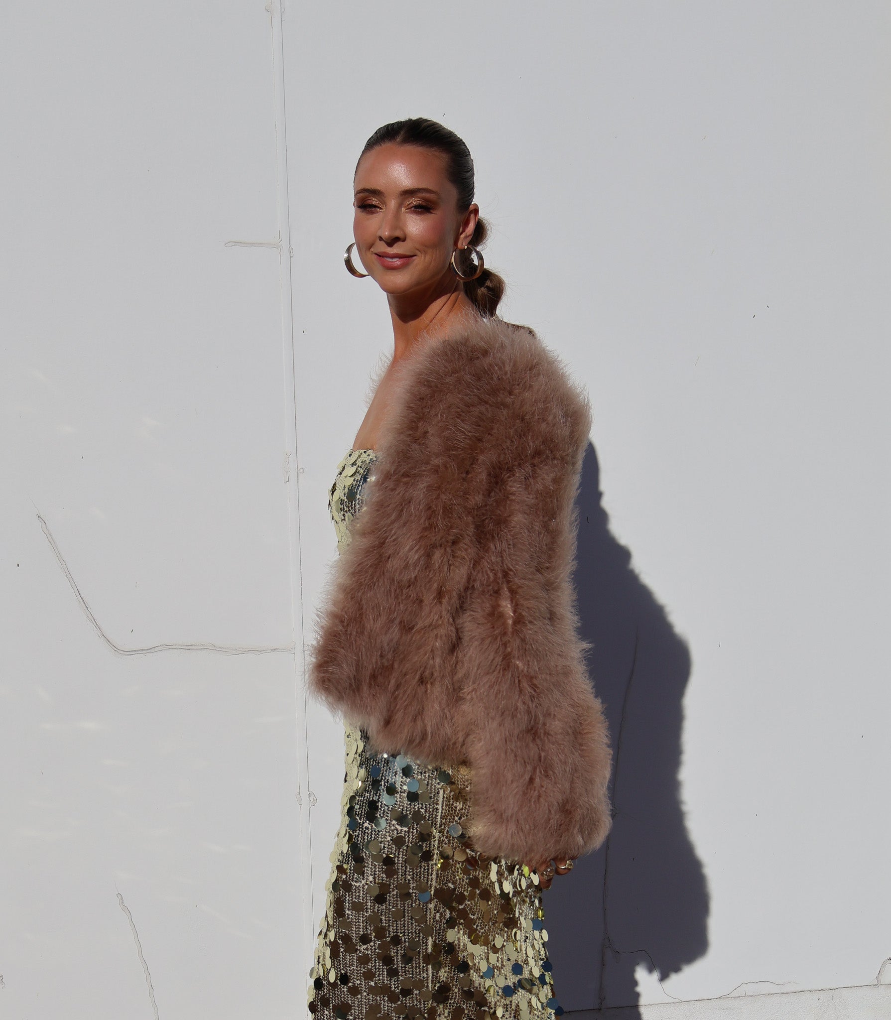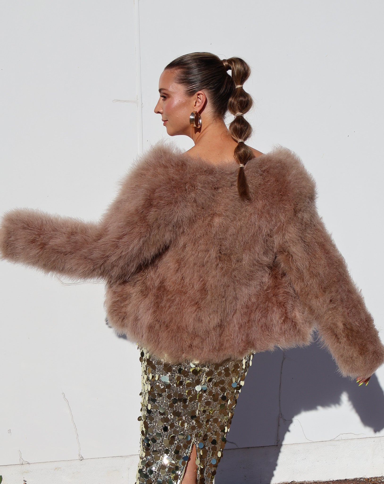 The Saville jacket is made from 100% marabou feather with satin lining.