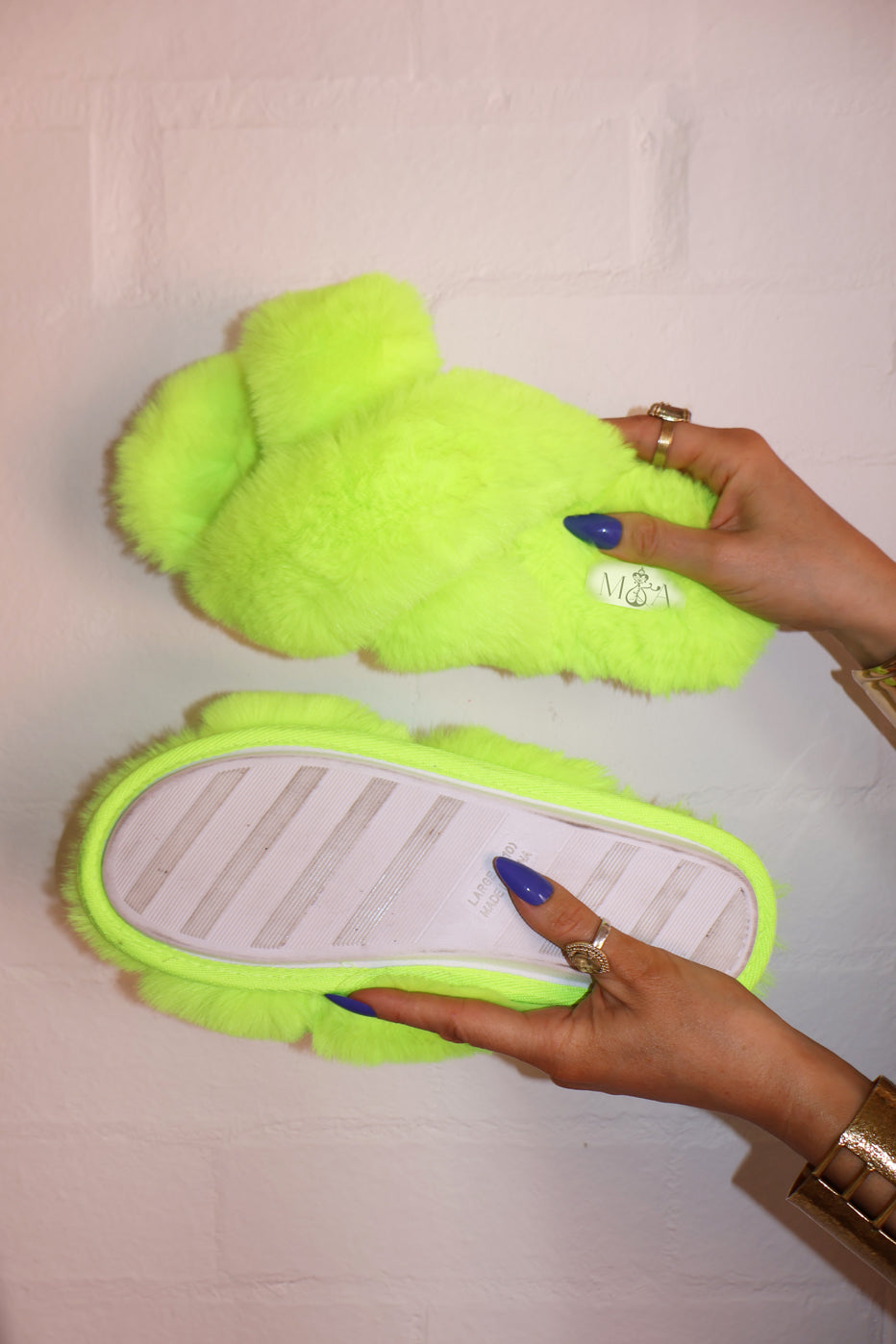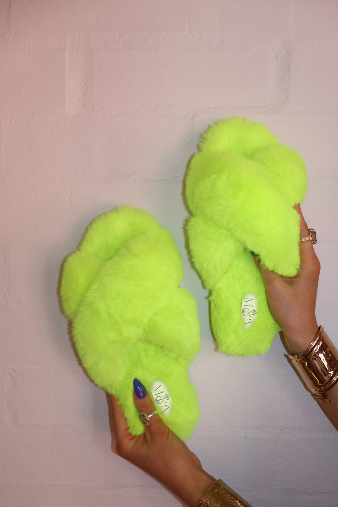 Say goodbye to boring slippers and hello to neon happiness! These bold, neon yellow fluffy slippers are the ultimate statement piece for your feet. With irresistibly soft criss-cross straps that hug your toes like a cozy cloud, you’ll feel like you’re walking on sunshine (literally).