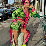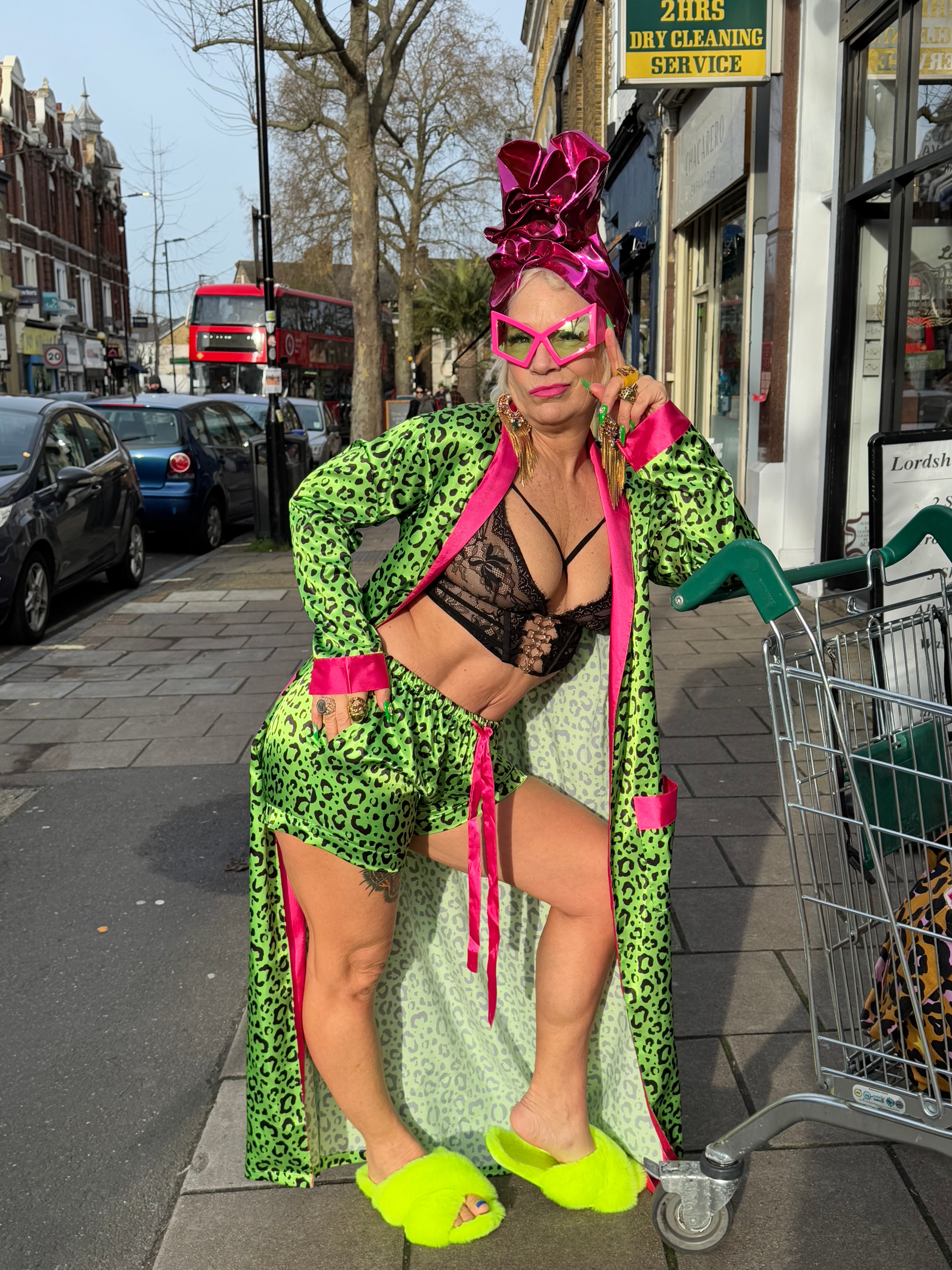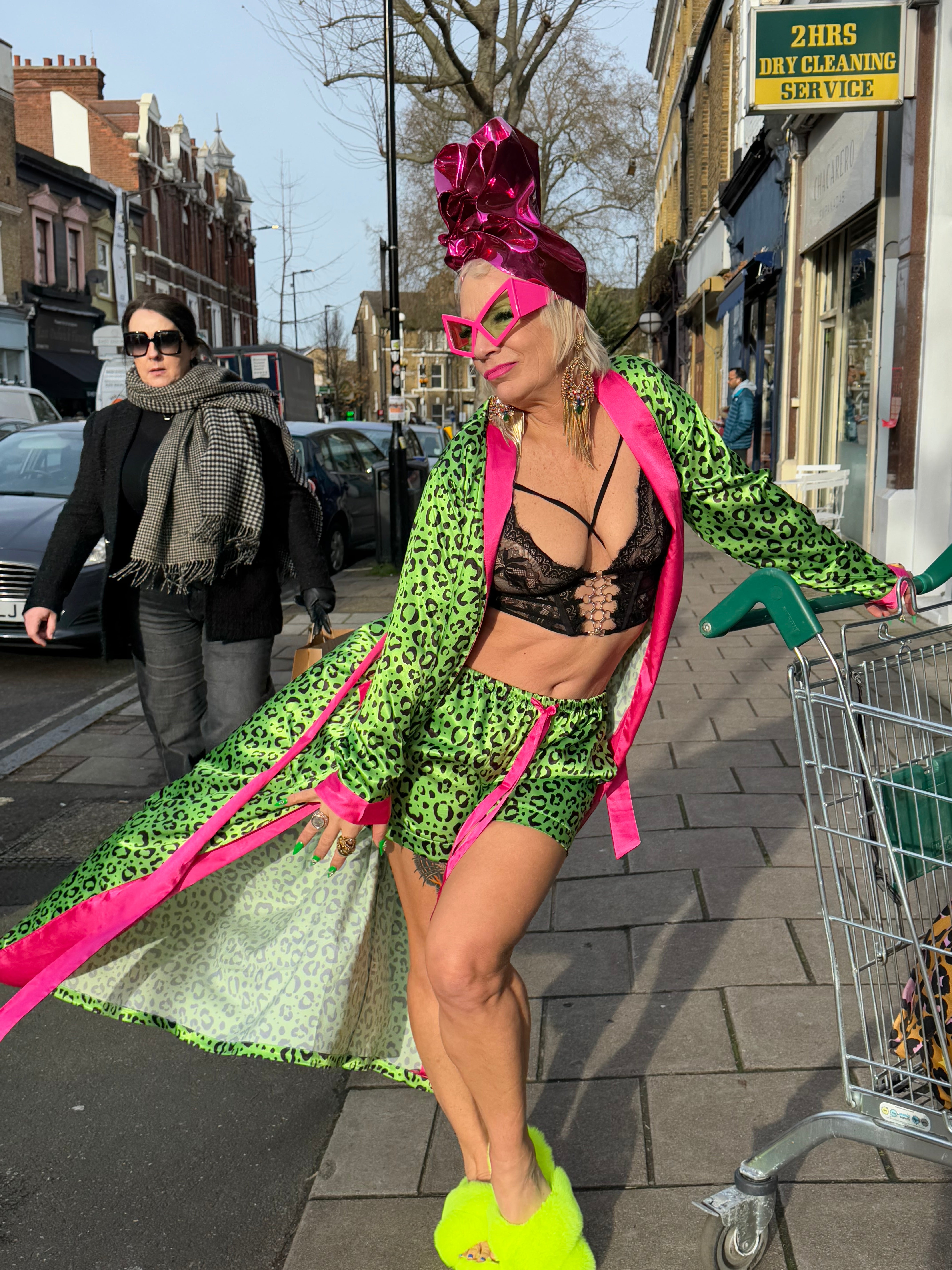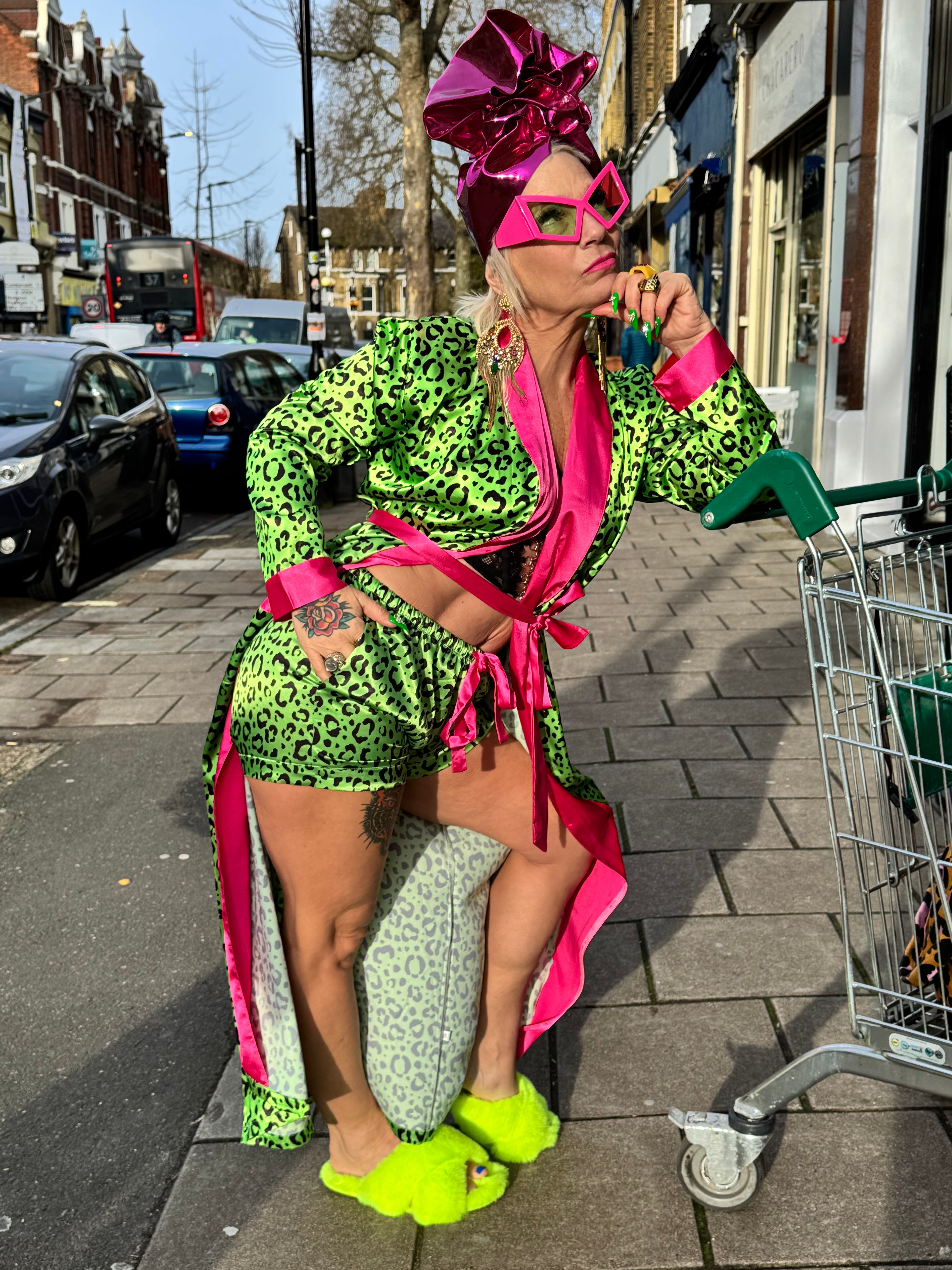 This curated line is dripping in high-octane glamour, featuring wild neon green leopard prints and sizzling hot pink that screams, “Knock knock b*tches, I’ve arrived!” Imagine prowling around in head-turning pyjama sets that blur the line between bedtime and red carpet, or stepping out in neon yellow slippers so fierce they deserve their own spotlight.